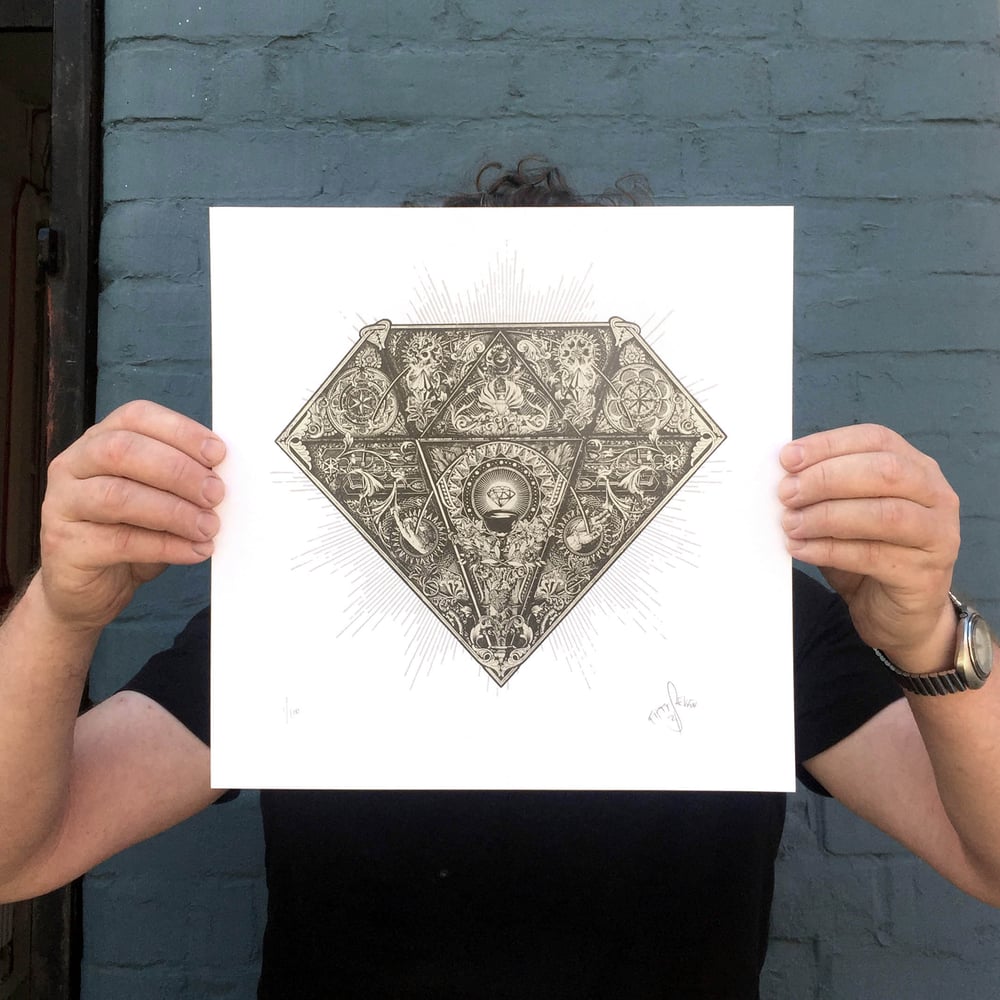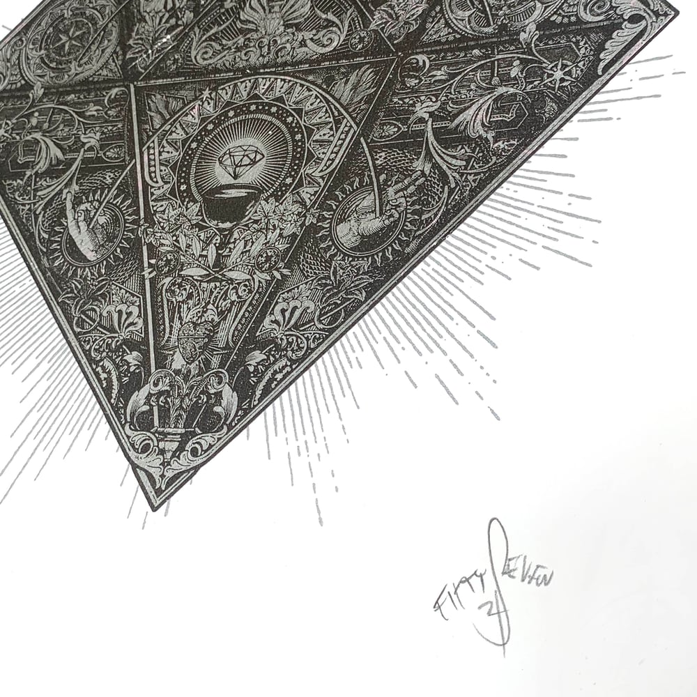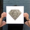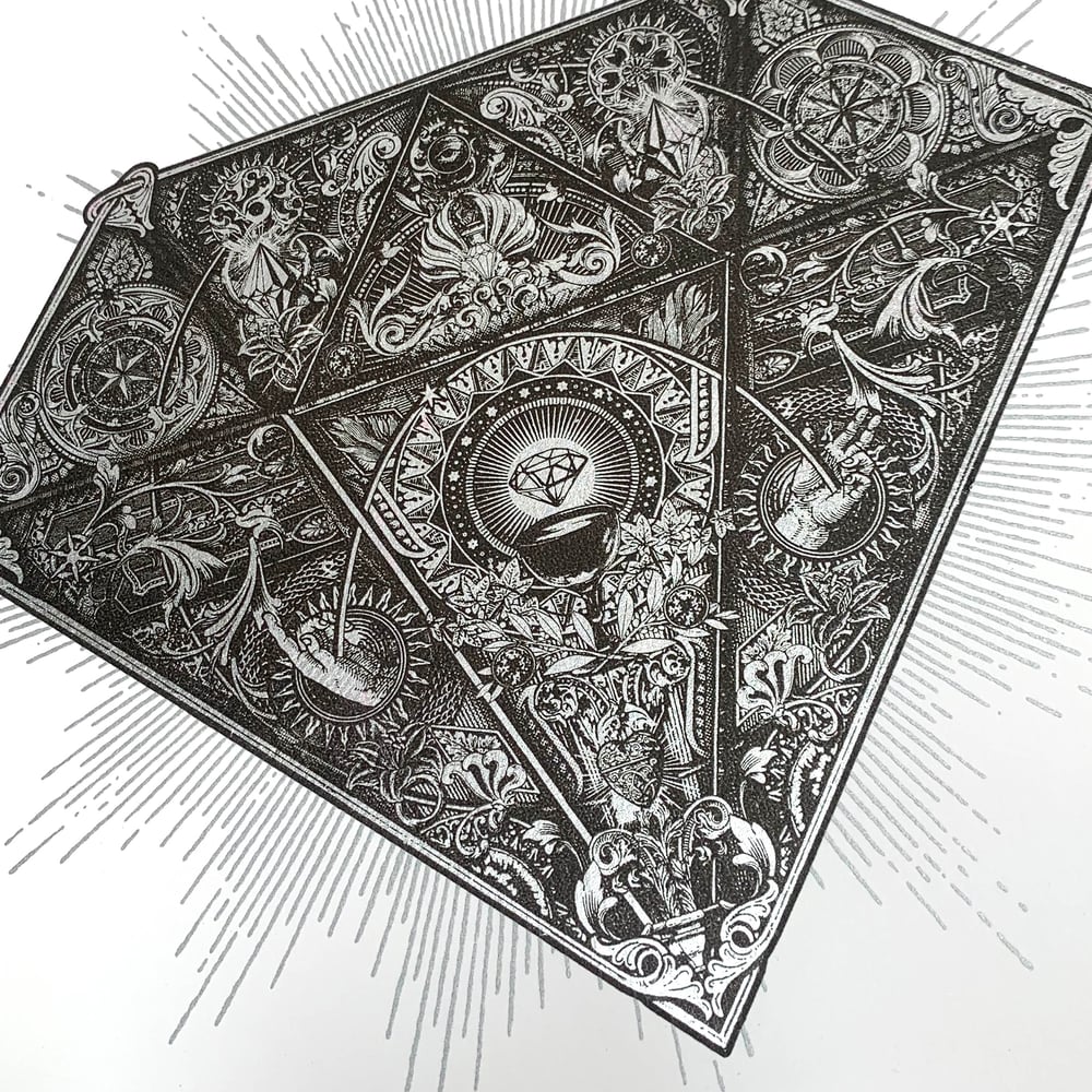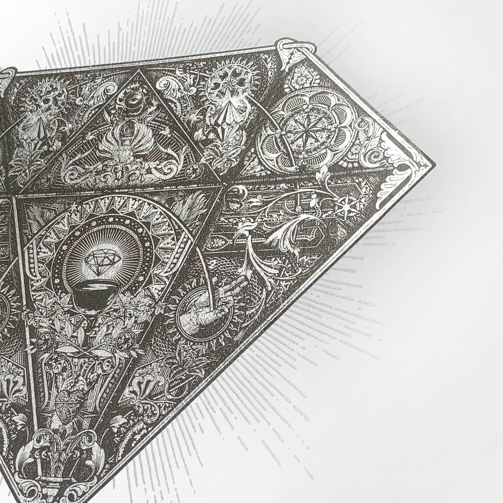 Screen print and silver foil diamond design.