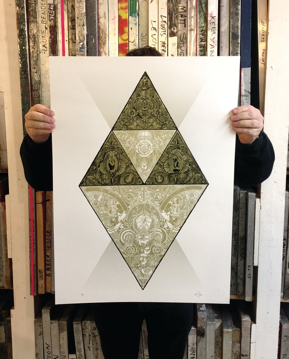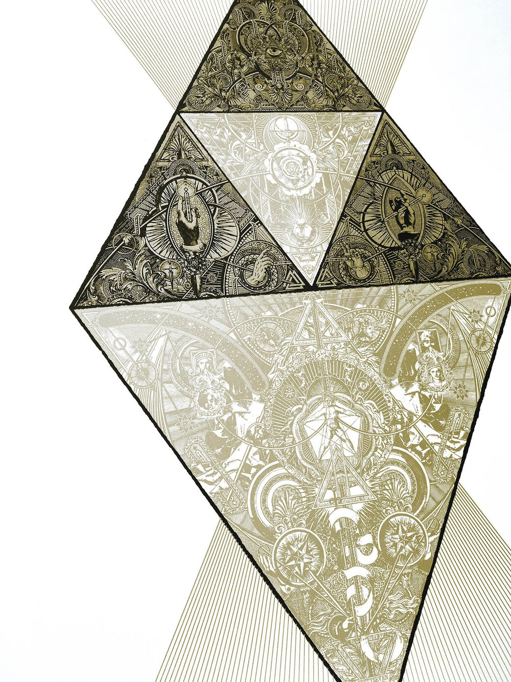 Two colour black and gold on 315gsm Heritage White paper 700 x 500mm. Signed, numbered and stamped by the artist in an edition of 50.