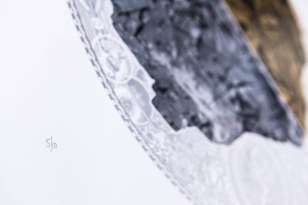 This is a 3 colour screenprint in black, metallic silver and gold, on 300gsm Fabriano 5 paper with 2 deckle edges at 700mm x700mm.