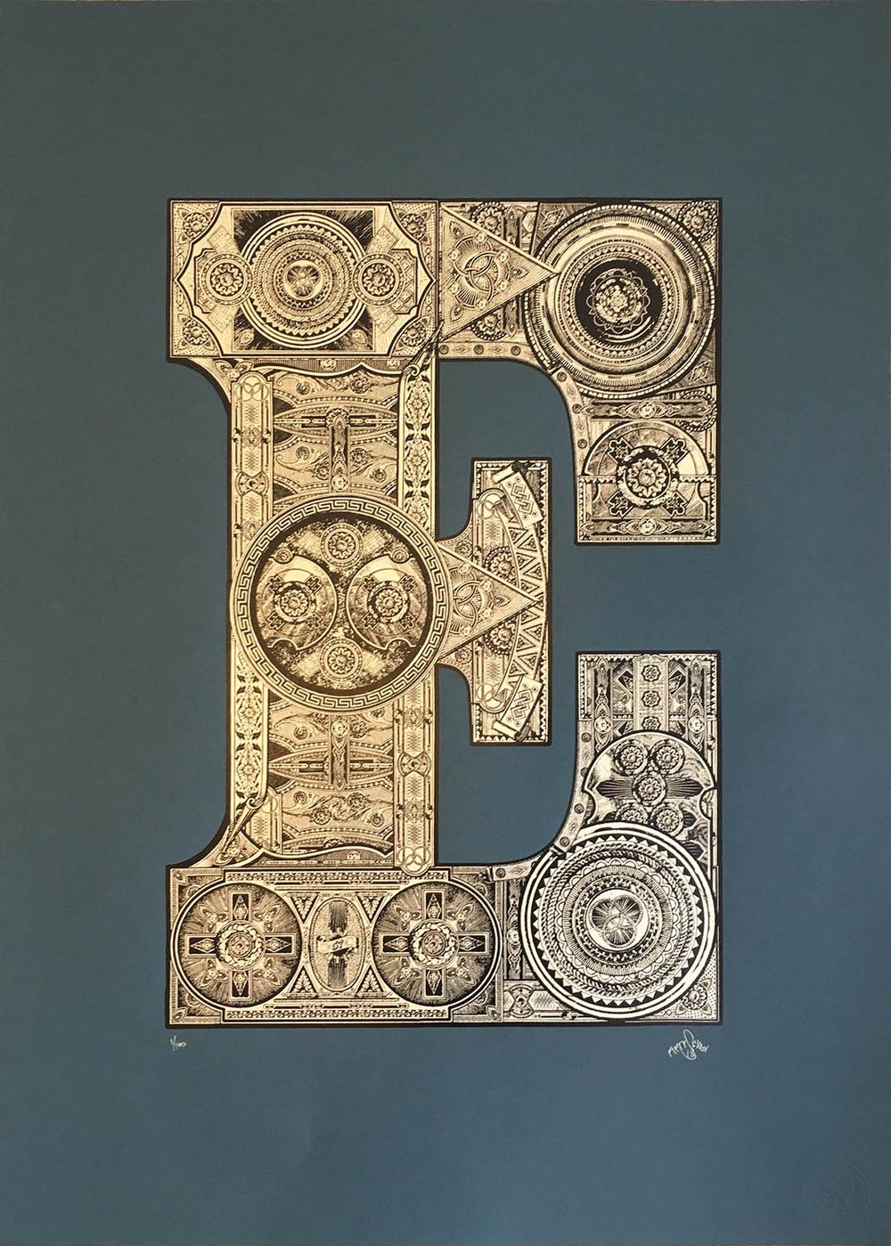 Two colour print, black and gold on 270gsm Colorplan British Racing Green. 700 x 500mm.