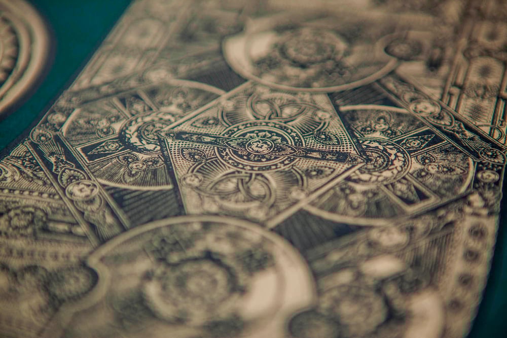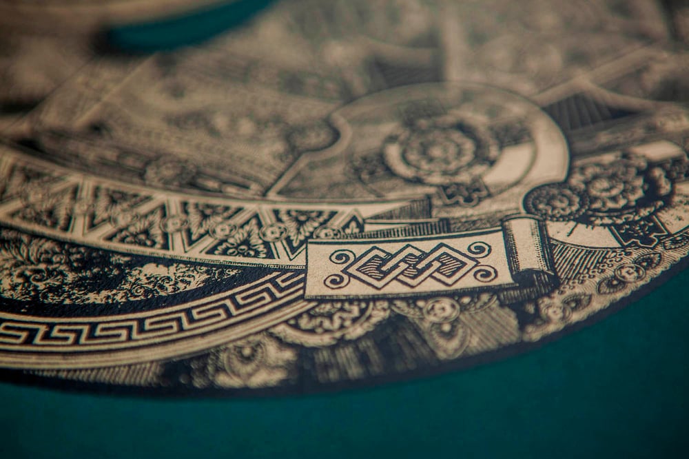 Two colour print, black and metallic gold on 270gsm Colorplan British Racing Green. 700mm x 500mm.